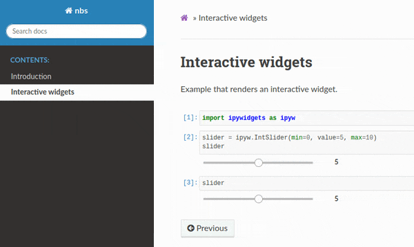 For example, if you create a notebook with a simple IntSlider widget from ipywidgets and save the widget state, the slider will render correctly in Sphinx.